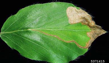 The mining activity of the weevil larvae leaves a characteristic mine pattern useful for identifying the presence of the weevil. A narrow linear mine is seen from the mid-rib of the leaf to the leaf margin where there is a blotch mine (photo). The leaves may turn brown around the edges and wilt.